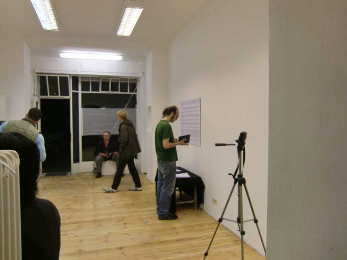 In dieser Weise transportiert er den Raum seines Atelier in der Öffentlichkeit (und wir können ihn auf dem Boden bidimensional geklebt, entlang seiner genau berechneten Ausmaßen im Freiraum ablesen), misst er mit mathematischer Regelmässigkeit die Zeit die sich in einem Raum abgespielt hat (wie in einer a-subjektiven Beobachtung ihrer Variationen), registriert er eine (seine) persönliche Geschichte, die unter Form von Fakten aufgehalten werden kann (der Raum wird bedeckt von dokumentarischen Notizen, und wird ein Dokumentraum, also wird zu einer Archive) oder registriert er die zeitliche Wiederholung einer Geste in einem Raum (jedes Mal wenn er seine Wohnung betritt – wie eine Mikromodifikation, die der Raum erfährt).